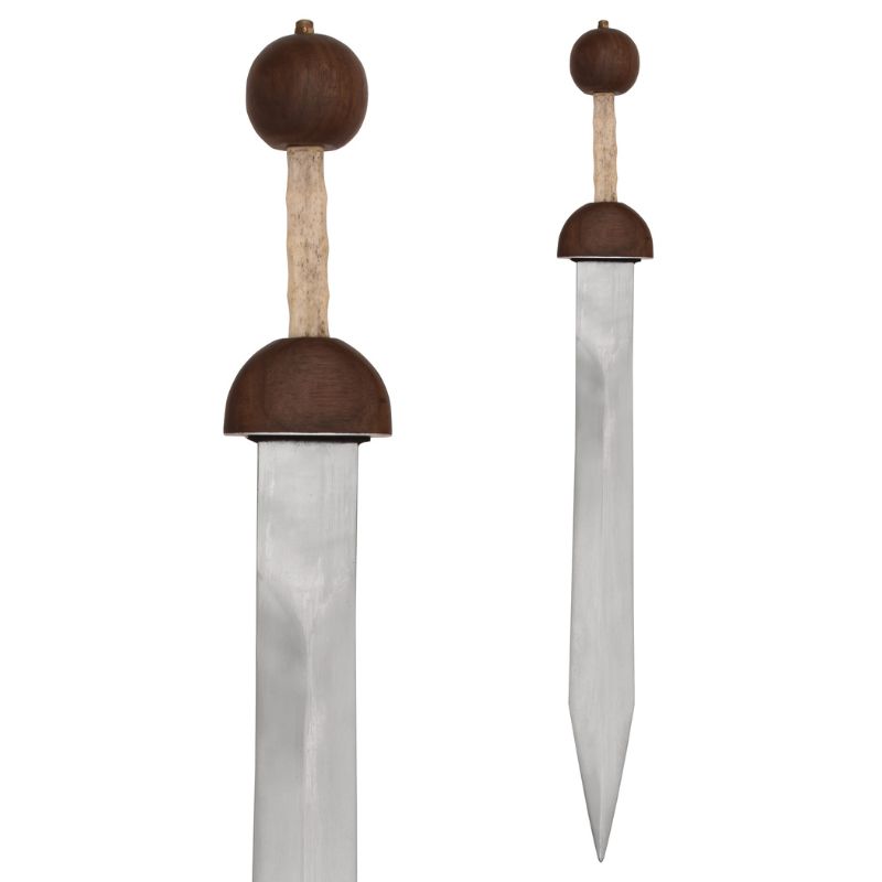 Replica di un gladio romano, come quelli utilizzati dai legionari intorno al periodo della nascita di Cristo. Il pomolo e la guardia sono realizzati in pregiato legno duro, mentre l’impugnatura è in vero osso animale. La lama in acciaio attraversa completamente l’impugnatura (full tang) ed è avvitata al livello del pomolo.