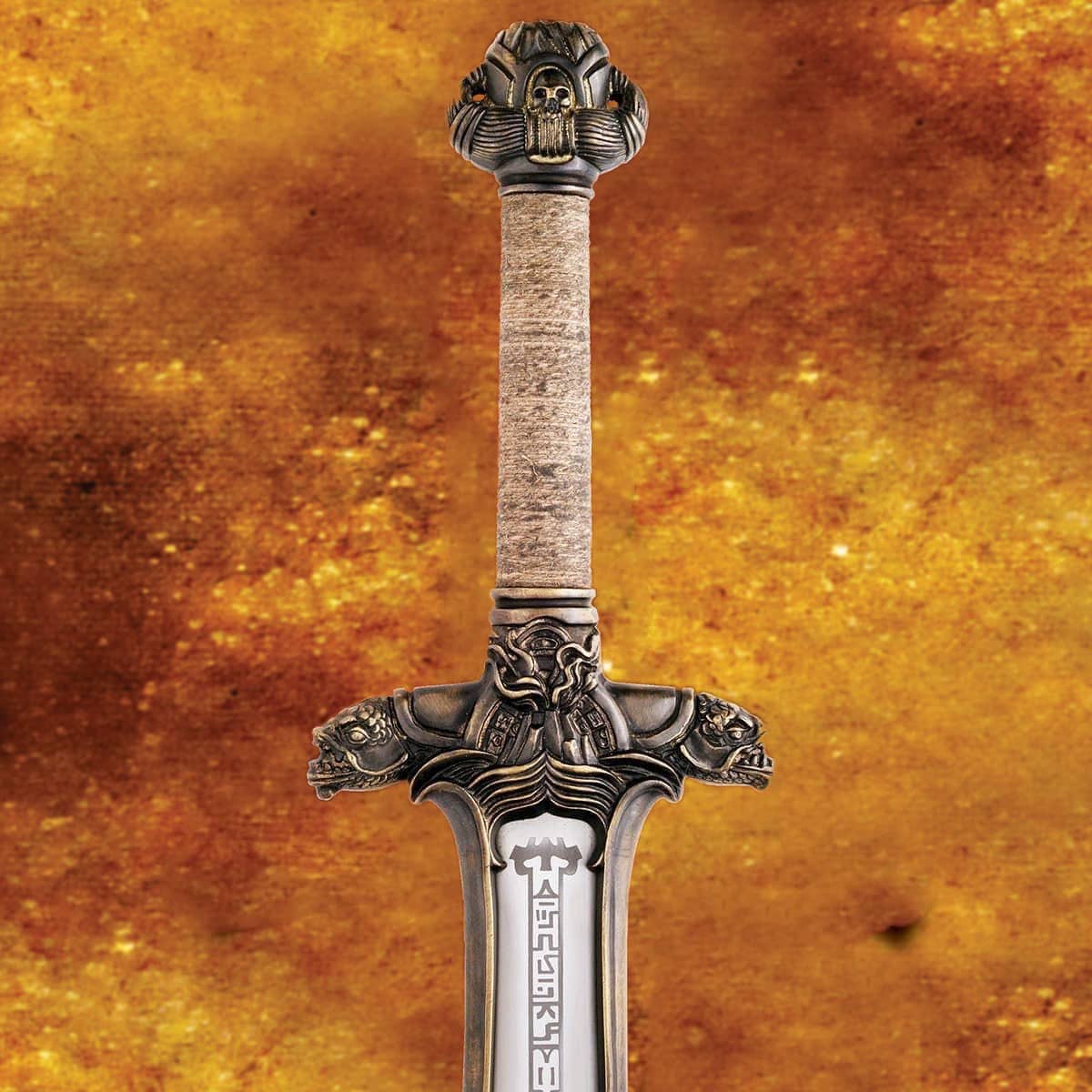 Forgiata a mano in acciaio ad alto tenore di carbonio (1085) e temprata a 52 HRC per garantire la resistenza, questa spada è stata sapientemente riprodotta dai maestri artigiani di Windlass Steelcrafts® come replica esatta della spada utilizzata sullo schermo. Dai dettagli intricati sull’elsa e sul pomo alle profonde rune sulla potente lama, questa è davvero una riproduzione magistrale.