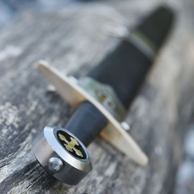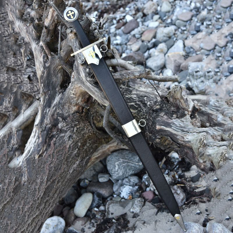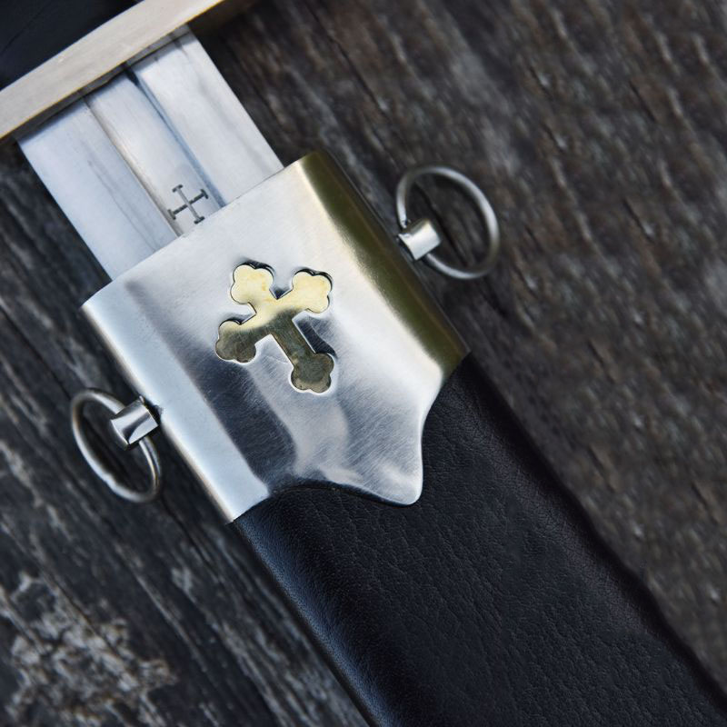 La spada templare presenta una lama a doppio filo, che si assottiglia verso la punta. Una scanalatura corre lungo quasi tutta la lama, accompagnata da incisioni di croci templari su entrambi i lati. La guardia in ottone è anch’essa decorata con croci templari incise. L’impugnatura in legno avvolta in pelle nera termina con un pomolo a disco decorato su entrambi i lati con croci trifogliate in ottone.