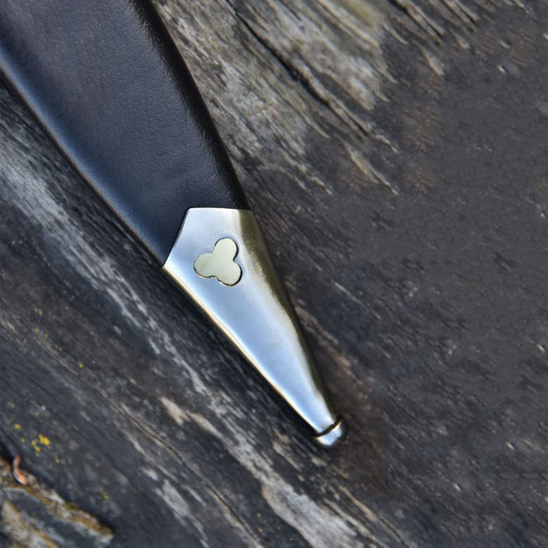 La spada viene fornita con un fodero in legno rivestito in pelle nera, ornato con finiture in acciaio: puntale, fascia centrale e terminale, oltre ad anelli di sospensione mobili. Elementi decorativi in ottone impreziosiscono anche l’imboccatura e il puntale.